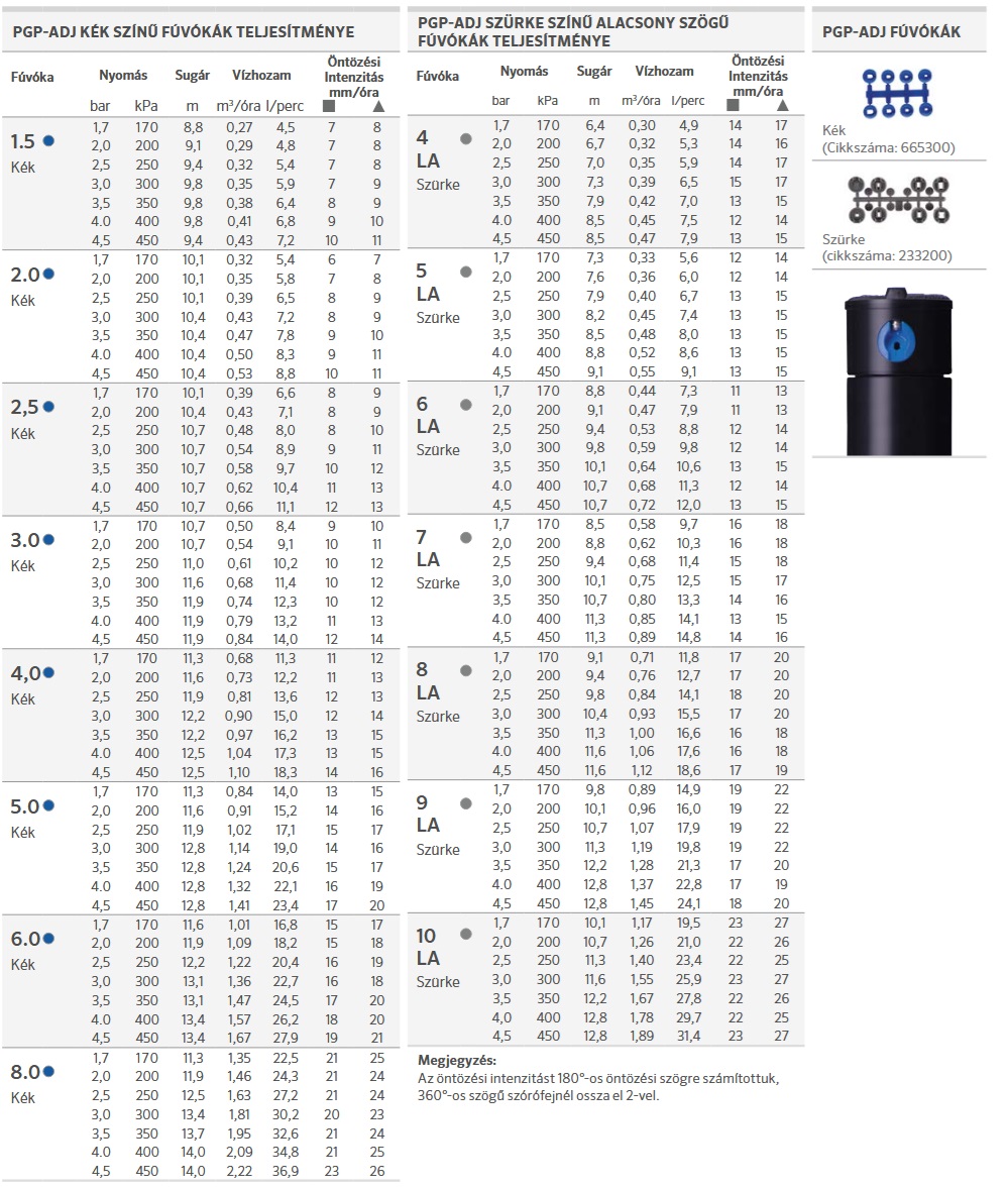 Az alábbi táblázatban látható a teljesítmény 3,5 bar (350 kPa) nyomáson a leggyakrabban használt fúvókákkal: