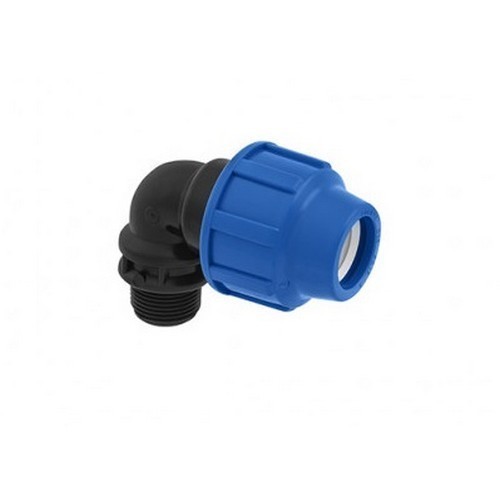 KPE könyök K 32x 3/4 col külső menetes idom. 32 mm KPE cső 90 fokos iránytöréssel és 3/4 col külső menetes csatlakozással.