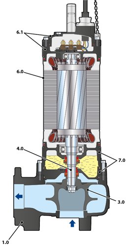 Kétcsatornás Járókerék – Maximális Áteresztőképesség, Minimális Eltömődés: A szivattyúban egy innovatív, kétcsatornás járókerék (dual channel impeller) található. Ez a speciális kialakítás minimalizálja az eltömődés kockázatát a szilárd részecskékkel, miközben maximalizálja a hidraulikai hatékonyságot. A folyadék és a szennyeződések akadálytalanul áramlanak át a szivattyún, biztosítva a folyamatos és megbízható működést, még extrém terhelés mellett is.