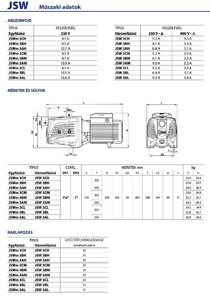 - Teljesítmény: A JSW3 szivattyúk teljesítménye jellemzően 1,5 kW (2 LE) és 2,2 kW (3 LE) között mozog, ami bőséges erőt biztosít a nagyobb vízigényű alkalmazásokhoz.