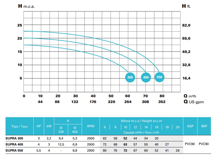 A SACI IE3 Supra szivattyúk többféle teljesítményben elérhetőek. Az alábbi táblázat egy általános mintát mutat be, amely a sorozat jellemző adatait tartalmazza. Kérjük, válassza ki az Ön által forgalmazott konkrét modellre vonatkozó pontos adatokat a gyártói specifikáció alapján.