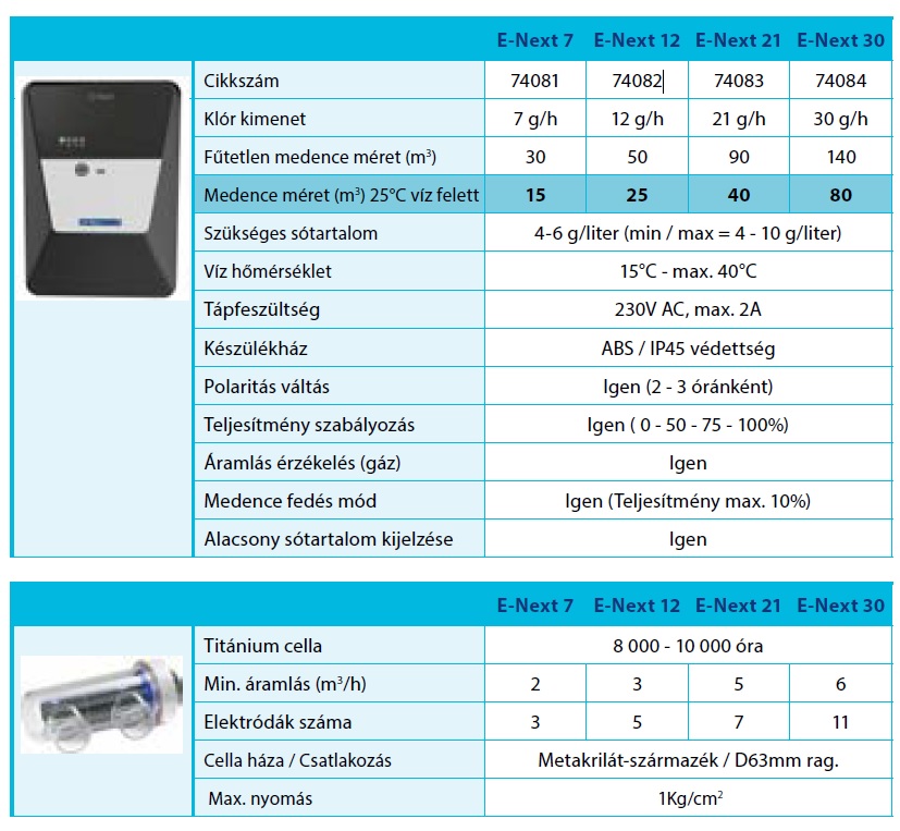 Korszerű Elektronikus Vezérlés – Megbízhatóság és Pontosság: Az E-Next széria korszerű elektronikus vezérléssel működik, amely pontos és megbízható működést biztosít. Az intelligens vezérlés optimalizálja a klórtermelést az aktuális igényekhez igazodva, és védi a rendszert a túlműködéstől.